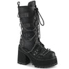 4 3/4" (121mm) Block Heel, 2 1/4" (57mm) Cleated Platform Lace-Up Front Knee High Boot Featuring Eyeletted & Cone Spike Studded Straight-Jacket Style Hanging Strap & Back Buckle Ornaments, Inside Metal Zip Closure
