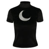 Introducing our Moonglow Choker T-shirt: A mesmerizing fusion of celestial elegance and dark allure. Crafted in sleek black, it features a striking V-cut neckline adorned with a chic choker detail. Awash with a celestial symphony of purple and blue moths, moons, and enchanting flowers, it brings a touch of cosmic magic to your wardrobe. Elevate your style and embrace the night with this captivating piece.